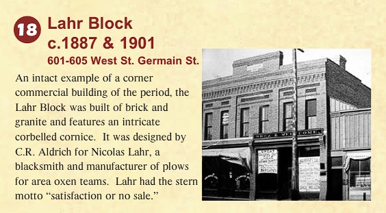 as an investment property for local blacksmith and businessman Nicolas Lahr. The building was remodeled to combine three buildings into one in 1901. Among Mr. Lahr's first tenants were Columbia Bookstore, F.W. Price Clothing, Charles F. and George S. Brigham - physicians, Peter Brick - Attorney and real estate, Edward and Woods Co., Ms. M.E. Sullivan - hair dresser, Ira L. Edmunds - physician, and Hubert Hansen - Attorney, Real Estate and Insurance. Later tenants included RF. Bryant's Drugstore, Kinney's Shoes, Goodman's Jewelers, Connie's Bridal, Murphy Music Co., Ragstock clothing, St.Cloud Children's Museum and Geocomm.