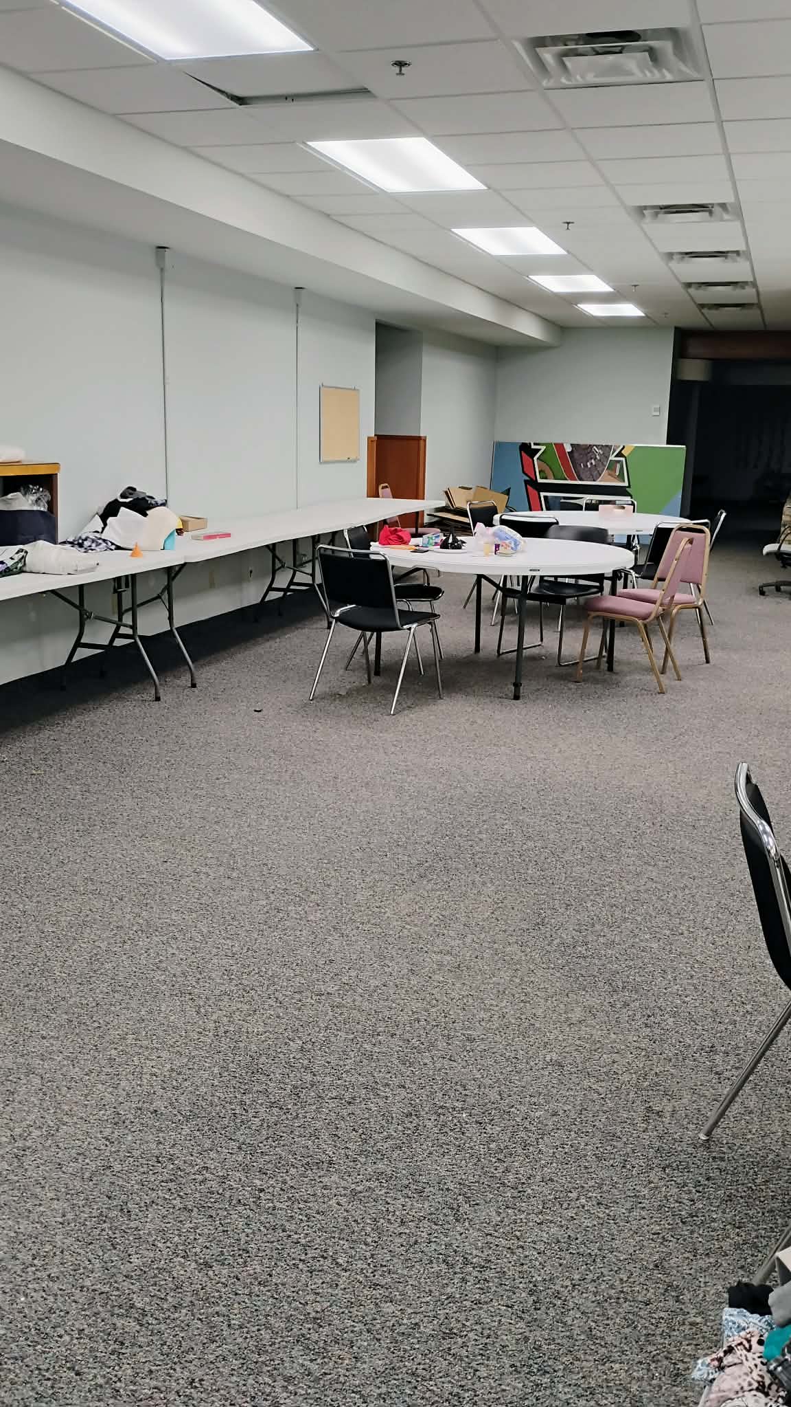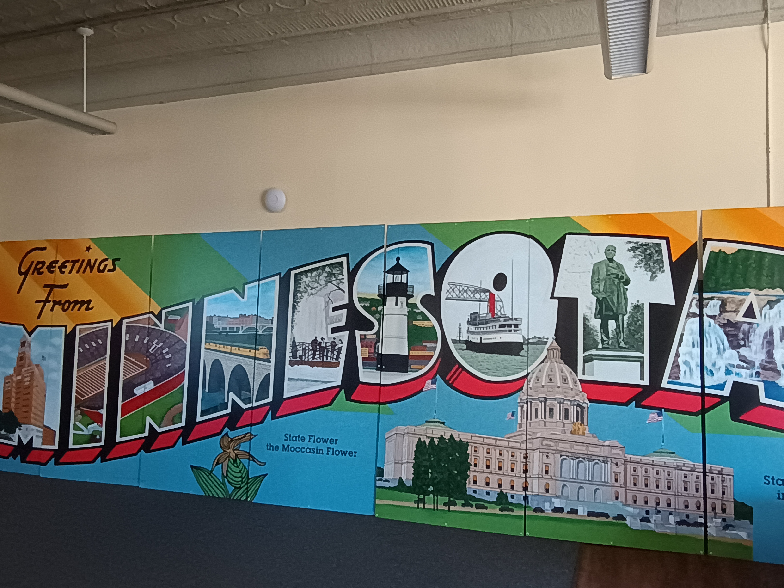 The Dining area is conveniently located directly down from the kitchen and works beautifully for buffets, catered events and the like. The dining area also joins our Northstar classroom area which can be used for more dining space or for events like workshops, speakers, meetings, presentations, parties, and whichever events may need a highly flexible space. The Northstar classroom also hosts our beautifully handpainted Minnesota mural.